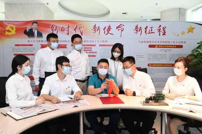 9月9日上午,中国邮政集团有限公司直属机关青年员工学习习近平总书记在全国抗击新冠肺炎疫情表彰大会上的重要讲话精神座谈会召开。作为一名准“90后”,刚刚获得全国抗击新冠肺炎疫情先进个人荣誉称号的湖北省武汉市江岸区邮政分公司上海路投递站投递员徐龙,与集团公司直属机关青年员工代表进行了深入交流,希望和广大青年邮政员工一道,继续秉持“人民邮政为人民”的初心使命和服务宗旨,立足本职、做好工作,不怕吃苦、不怕受累,善于学习、乐于学习,为企业、为社会多做贡献。图为徐龙向大家展示全国抗击新冠肺炎疫情先进个人奖章。
