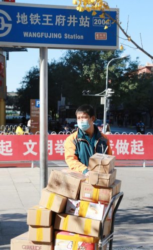 在王府井食品商场鳞次栉比的商户中间,谭海波拉着一辆折叠平板车,逐个铺位“扫货”——将商户们封好的包裹整齐地码放装车。不到30分钟,他已经揽收了50多件包裹,这些包裹有的是游客们来京旅游的纪念品,有的是网友们“双11”疯狂购物的“战利品”。在接下来的几小时中,它们将跟随王府井营业部的邮车运往全国。