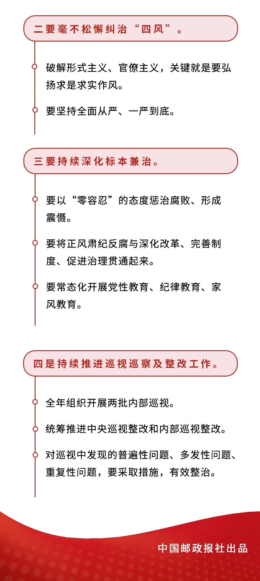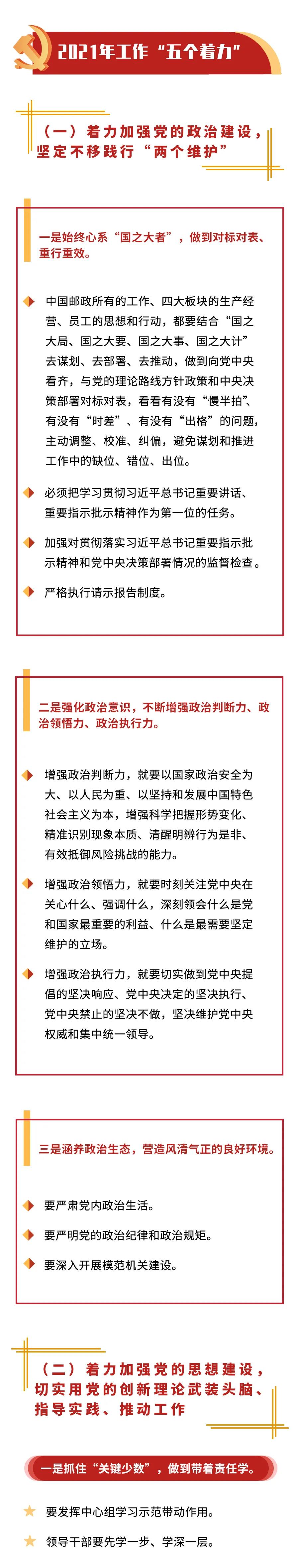 1月28日,2021年中国邮政集团有限公司党的建设暨党风廉政建设和反腐败工作会议召开。这次会议是在中国邮政立足新阶段、迈向新征程的重要时刻提升政治站位、激发担当作为、凝心聚力推动发展的一次政治动员。会议总结2020年中国邮政党的建设以及党风廉政建设和反腐败工作,部署2021年重点任务,提出把2021年作为“党建质量提升年”,以高质量党建引领高质量发展,为打造“六维共生”的新邮政、推动中国邮政二次崛起提供坚强政治保证。