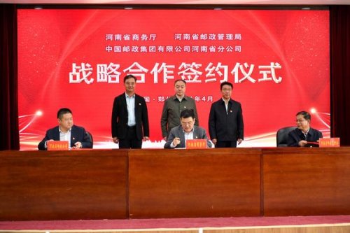 4月13日,河南省商务厅、河南省邮政管理局与中国邮政集团有限公司河南省分公司在郑州签署战略合作框架协议,以充分发挥商务系统和邮政系统优势,推动各方资源共享、优势互补,进一步提高商务和邮政服务河南经济社会能力,为农村流通体系建设营造良好的发展环境,在助推乡村振兴战略实施上实现更大突破。