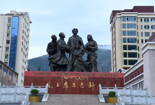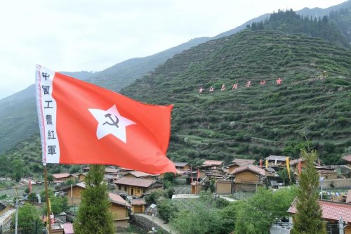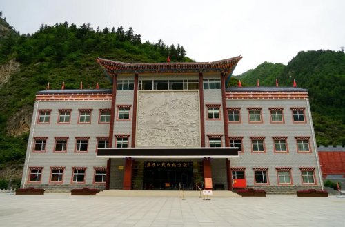 沿着迭部的山路逶迤前行,只见道路两旁红旗招展,一个个五角星挂在树上随风摇曳,红色的民宅依山而建,墙面上刻画着红军故事,红房碧草黛山在蓝天白云的映衬下甚是吸睛,硕大的“红色腊子口”标语,无不提醒着我们,腊子口近了更近了。