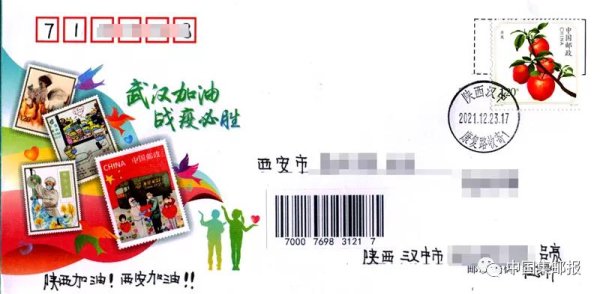 远在汉中市的邮迷吕亮,在西安封闭管理第一天,特别制作了“西安加油”纪念封,贴上“苹果”邮票,盖上“康复路”邮戳,从汉中寄出,助力西安抗疫,希望大家平安早日康复。12月23日从汉中寄出,12月25日顺利到达西安。