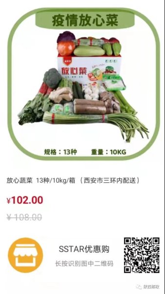 “疫情放心菜”通过邮乐网平台上线,一箱10kg,主要包含青笋、西红柿、西兰花、大辣椒、蒜薹等14种耐储存蔬菜。市民只需识别“疫情放心菜”二维码或点击“疫情放心菜”购买链接,填写地址下单,即可坐等邮政人员送菜上门。西安邮政同城网络将按下单顺序发货,全力保障菜品新鲜供应。