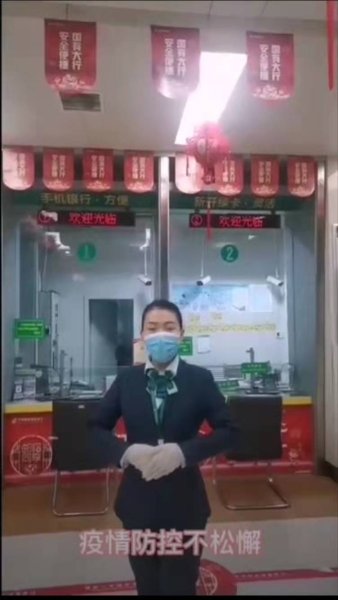 定边县分公司金融网点录制防疫宣传视频,在朋友圈及客户群发送,提醒客户做好防护,确保自身健康安全。(吴巧蓉)