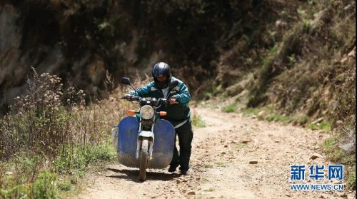 遇到陡坡路段,桑南才推着摩托车前行 赵普凡 摄