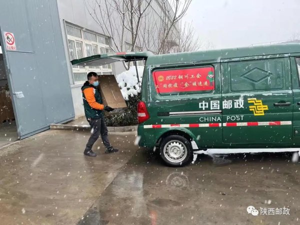 连日来,铜川市普降大雪,铜川市分公司各区县邮政投递配送员不畏道路湿滑结冰,仍然每天进行民众生活必需品配送。