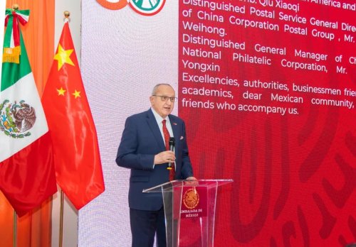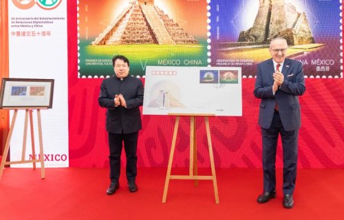 为庆祝中国与墨西哥建交五十周年,墨西哥驻中国大使馆于2月14日举办了隆重的纪念仪式,并同时举行该主题邮票首发式。墨西哥驻华大使施雅德、中国政府拉美事务特别代表邱小琪、中国邮政集团有限公司相关负责人出席活动。
