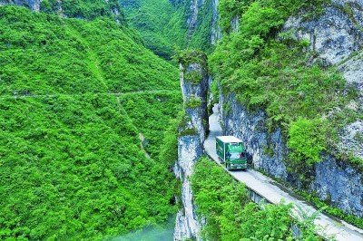 邮车行进在大渡河大峡谷入口的悬崖绝壁之上。 新华社发