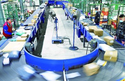 在中国邮政衡阳邮区中心局邮件处理中心,工作人员在分拣快递包裹。 新华社发