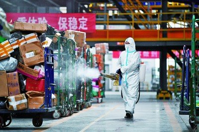在中国邮政宁夏银川邮区中心局邮件处理中心,工作人员在分拣车间进行消杀作业。 新华社发