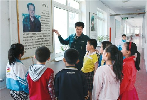 王明杰向苇沙河镇小学的同学讲述邮政“铁人”宫本玉的事迹。□王家柱 摄