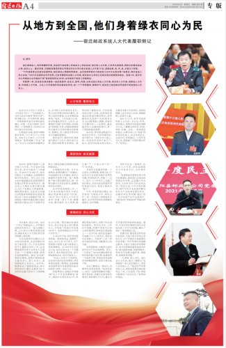 他们是邮政人,传民情履职尽责,用实际行动诠释人民邮政为人民的宗旨;他们是人大代表,汇民声共商国是,把群众的需求装在心里、放在心上。截至目前,中国邮政集团有限公司宿迁市分公司已走出各级人大代表10名,涵盖全国、省、市、县、乡镇五个层面。