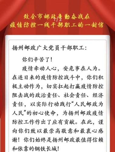 一封致全市邮政辛勤奋战在疫情防控一线干部职工的慰问信,成为大家共克时艰的精神食粮。