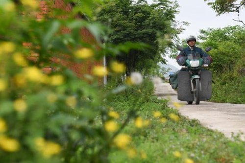 在安徽省巢湖市散兵镇山口村,郑爱军骑行在投递邮件的路上(4月30日摄)。