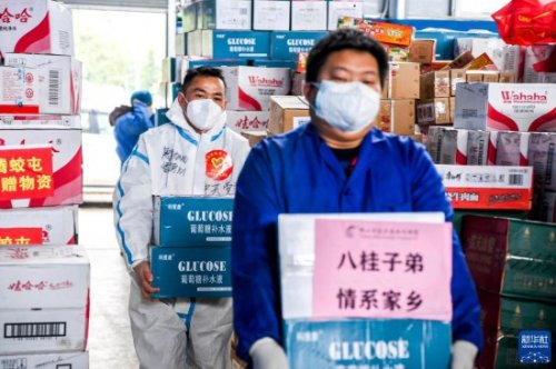 2月15日,在广西百色市德保县一处仓库,工作人员在搬运抗疫物资。新华社记者 曹祎铭 摄