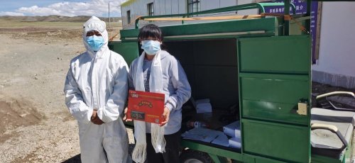 巴桑彭措(左)将录取通知书送到牧区孩子手中。(受访者供图)