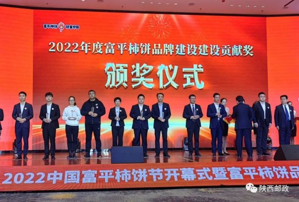 11月25日,2022年中国富平柿饼节暨首届富平柿饼全球经销商大会在陕西富平隆重举行,富平邮政作为区域公用品牌授权企业受邀参加会议,并被富平县政府授予“富平柿饼品牌建设贡献奖”荣誉称号。