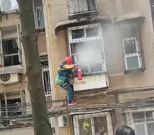 送报时偶遇起火,邮政投递员接过社区人员的灭火器爬窗扑灭