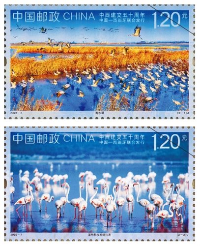 《中西建交五十周年》纪念邮票一套两枚。邮票画面以摄影作品为基础,表现了中国的衡水湖与西班牙的富恩特皮埃德拉湖,展现出两国湖泊的旖旎风光和自然生态特征,画面构图简约明快、表现意境清朗优美。该套邮票由马立航设计,北京邮票厂有限公司采用影写版工艺印制。西班牙邮政将使用同样的设计元素发行以“中西建交五十周年”为主题的邮票。