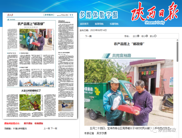 6月14日,《陕西日报》11版乡村振兴版刊发文章《农产品搭上“邮政绿”》,专题报道了近年来陕西邮政推广集农村电商、普惠金融、寄递物流等为一体的综合服务,为产业振兴和农村公共服务均等化方面贡献了邮政力量。
