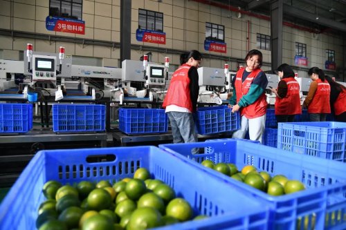 偌大的处理中心里,水果处理插上了智能化“翅膀”。一筐筐水果被送上智能分拣机器,按口径大小从不同的格口被分拣出来后,再进行打包装箱。