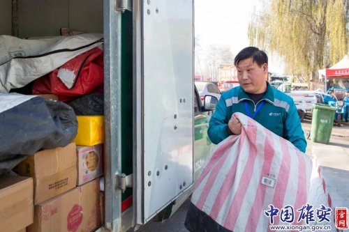 郭海玉正在将包裹搬上邮政车。中国雄安官网高盟 摄