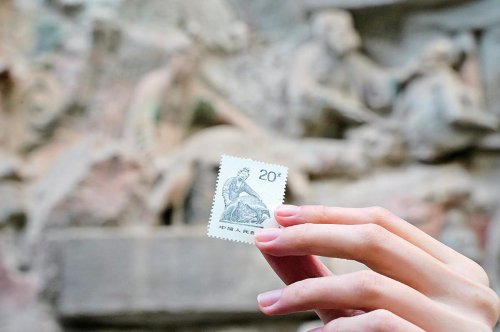 邮票上的大足石刻“养鸡女”。