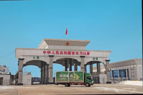 继续向西南方向进发,来到吉木乃县。在吉木乃口岸国门处,绿色的邮车正缓缓驶出。在吉木乃口岸海关监管库所在的吉木乃国际商贸城——中亚和中欧国际中转物流基地,邮政员工检查清点吉木乃国际仓内货物后,正与当日从哈萨克斯坦来的货运司机交谈,了解近期货物出口情况。