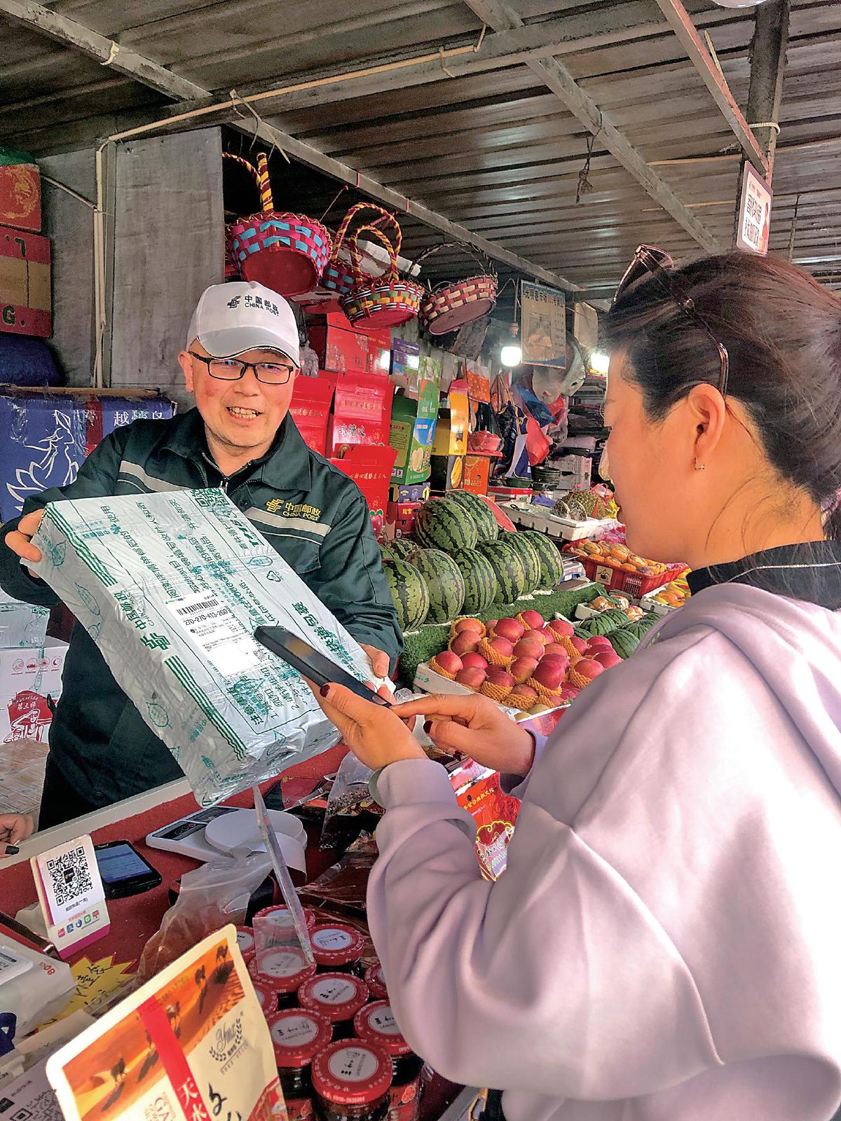 来自陕西的游客在天水市大众路光明巷邮政收寄点寄递甘谷辣椒面。