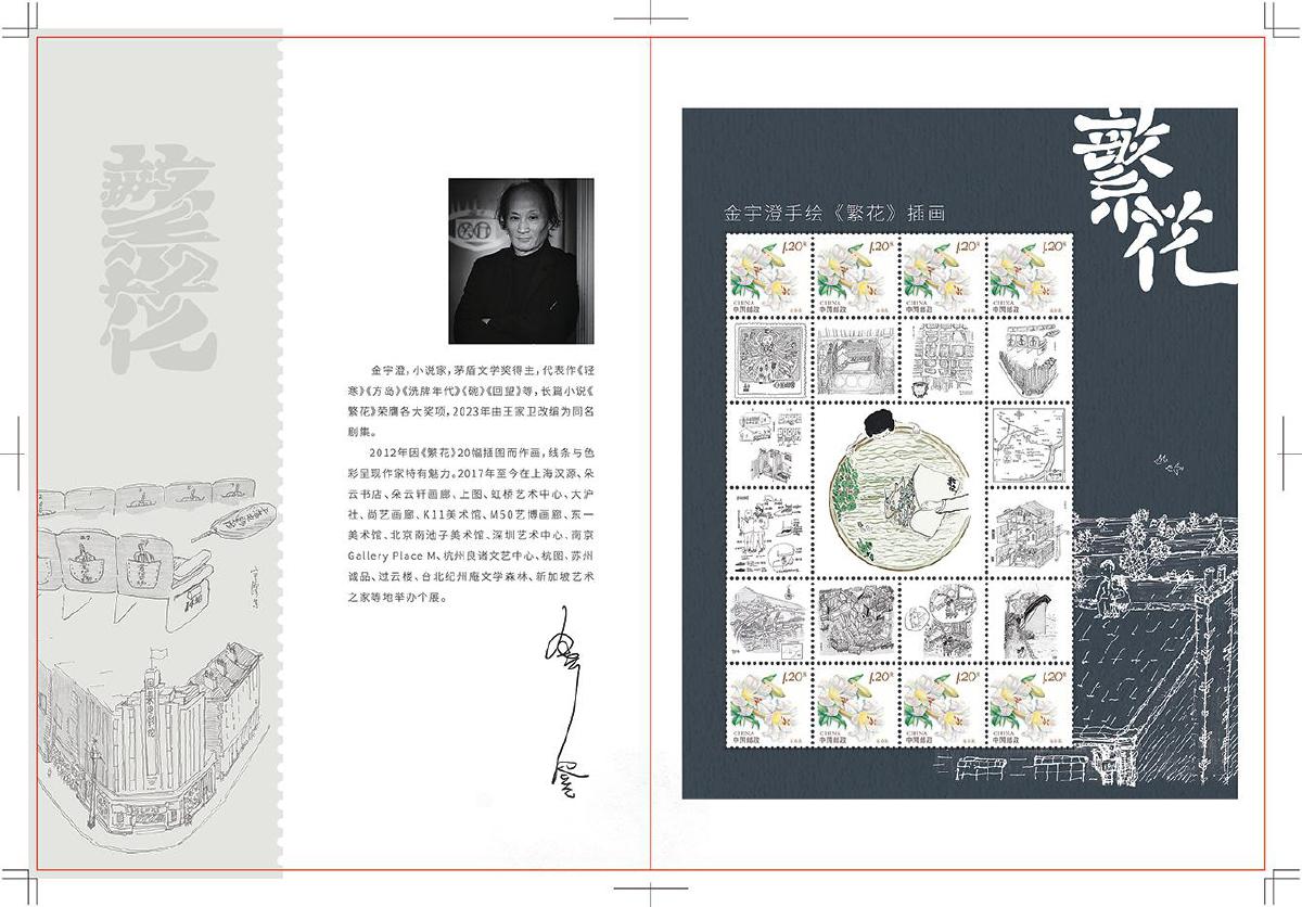 上海市分公司集邮与文化传媒部集邮业务室项目负责人贾寅承担着与金宇澄对接设计的工作。在数次的线上和线下联系中,他感触良多:“这次整体的沟通过程,让我感受到了剧中经常提到的‘不响’的处事态度。”据贾寅回忆,金宇澄在双方明确意向当天,就对所有手绘插图稿进行整理,精心挑选出反映小说中经典瞬间和场景的13幅插画,隔天就提供给上海市分公司进行设计制作,这种目标清晰、闷声做事、执行高效的态度让他印象深刻。对于图稿的细节,无论是字体还是颜色,金宇澄都一一斟酌、反复推敲,“‘繁花’二字与邮票边框处衔接应该是截平,而不是圆笔”“房子和屋顶是个标志,尽量露出来”“邮票上的展现应该比书本更精确”……贾寅感慨道:“从这数次沟通中,我感受到了他们这代人的邮票情怀,他们是真的懂集邮。我也感受到了他们高超的文化素养和审美水平。”