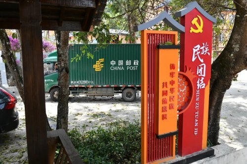 从阿里村出发,采访组沿着临近中缅边界的抵边村邮路前行,路旁的边界安全提示牌以及“党的光辉照边疆,边疆人民心向党”的红色标语牌都显示出这里特殊的地理位置。采访组一行的目的地班角老寨距中缅国境线仅1公里,与缅甸掸班和佤邦毗邻,素有“国门第一寨”之称。
