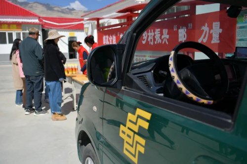 11点,炽热的阳光穿越云层,一辆绿色的邮车行驶在雪山下的笔直公路上。采访组跟随邮车进入兰干村,村委会院内已经是一派热闹景象。
