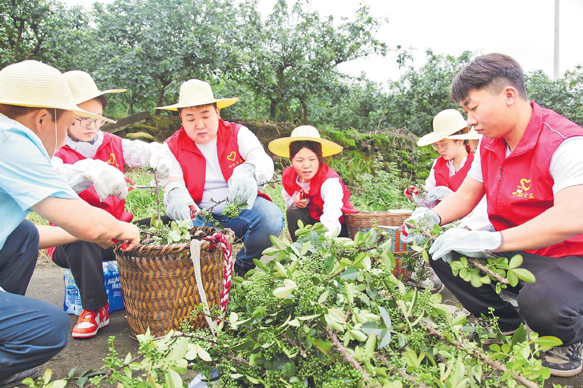 近日,重庆市江津区青花椒丰收了。江津区国际花椒产业城临时开市运营。在距市场不足1公里的先锋镇双宝村椒农袁必兰家的花椒地里,江津区邮政分公司一群青年员工身着红色志愿马甲,忙着提篮采摘花椒。花椒绿与志愿红的交织,共同绘就了一幅美好的丰收画卷。袁必兰对前来帮忙的邮政青年连声道谢。