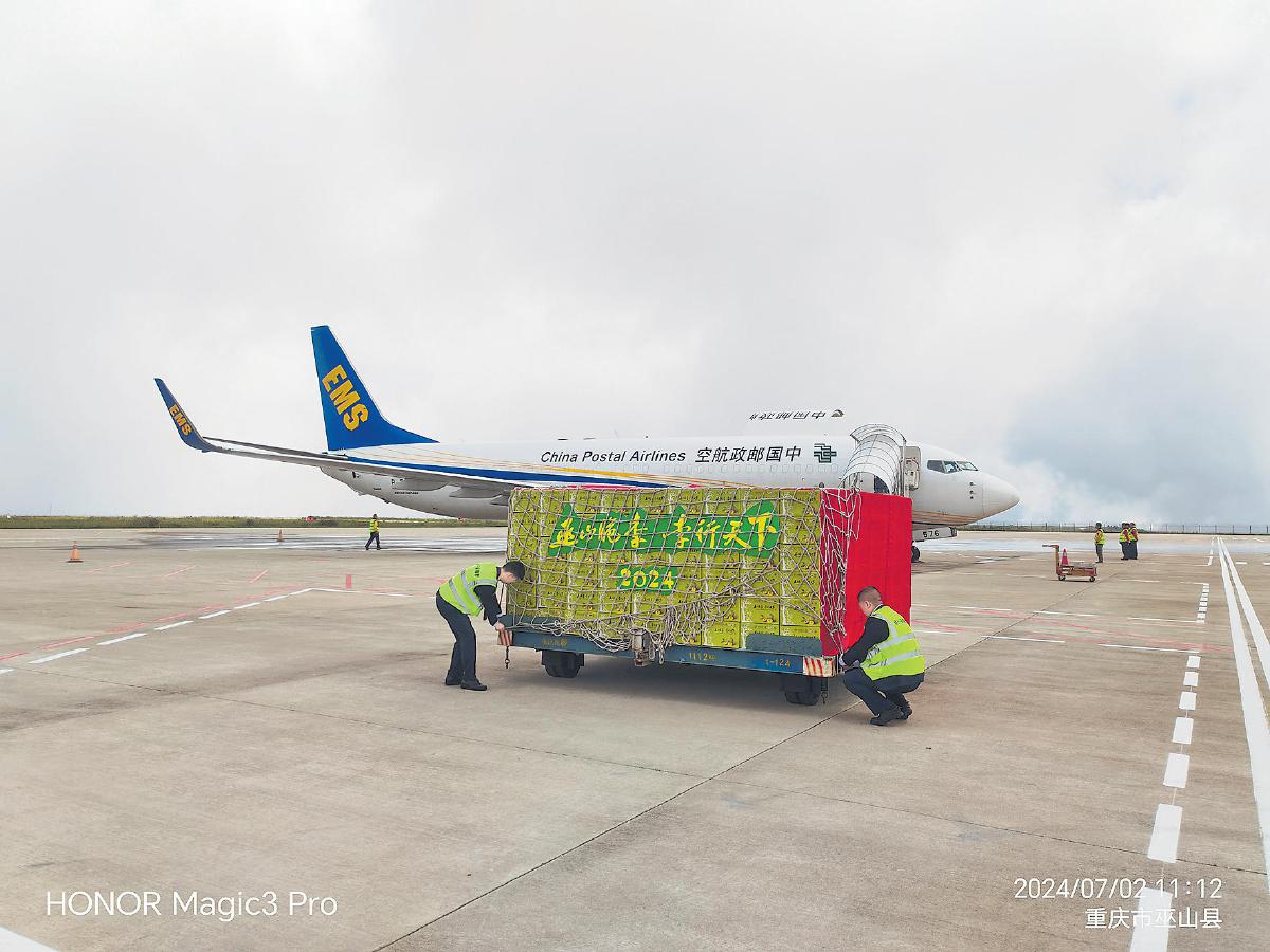 巫山脆李是重庆三大特色水果产业之一。截至2023年,巫山县脆李种植面积超过30万亩,年产值超过70亿元人民币。为助推巫山脆李等特色农产品畅销全国、走向世界,6月4日,集团公司批复开行2024年度“邮运通”“巫山—南京”巫山脆李极速鲜邮航专机,运行时间从7月2日开始,至7月20日结束。“邮运通”极速鲜邮航专机计划飞行15班次、载货量225吨。巫山脆李“坐”飞机抵达南京后,经南京集散中心分拨,在24小时内速运至全国各地,实现全国“1000+城市”次日达。