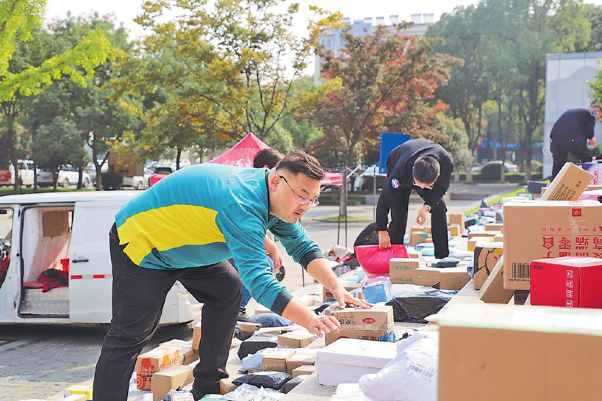 周江在整理即将投递的邮件。