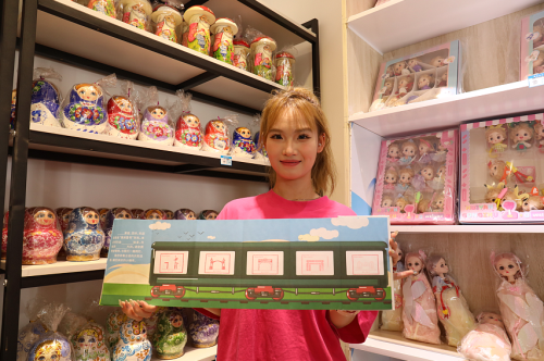 在俄式风情拉满的套娃主题邮局,采访组一行看到了套娃形状的邮筒、手绘套娃、套娃明信片、邮折、笔记本、冰箱贴等产品,这些产品吸引了很多小朋友的眼球。来自山东的中学生张同学对一款做工精美的套娃爱不释手:“感觉来到这里就像到了俄罗斯,这里的套娃都太精美了,每一款都想要!”