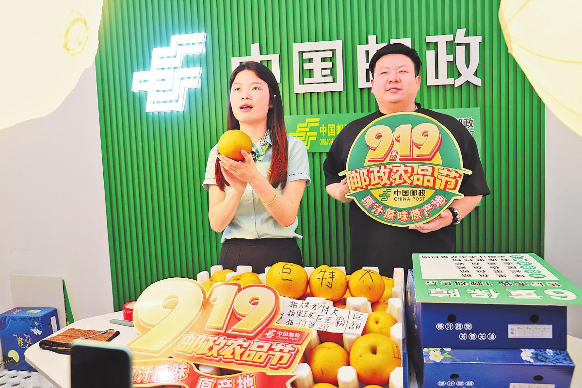 秋月梨成为老河口邮政电商直播的“主角”。□聂欣怡 摄