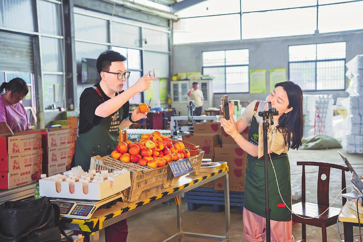 临沂邮政在农产品基地直播带货蒙阴蜜桃。□禚洪涛 摄