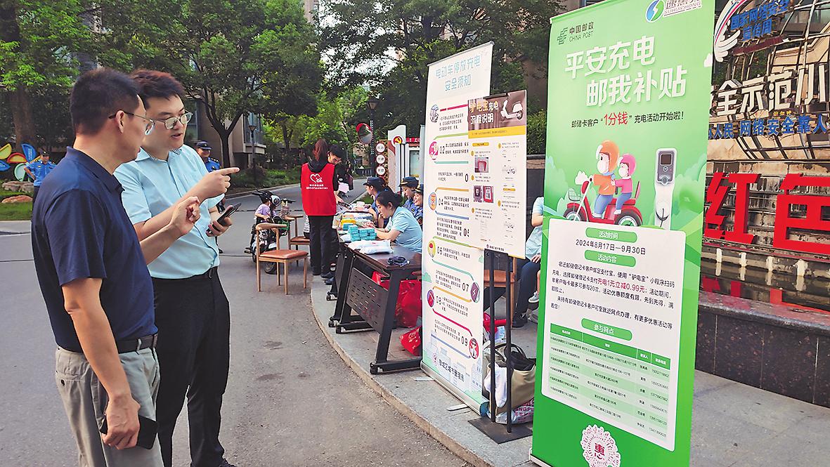 “插入充电插头,用微信扫描二维码,选择绑定的邮政储蓄卡支付,简单两步就可以享受优惠充电啦。”“太好了,对于我们上下班都要骑电动自行车的人来说太实惠了,这是邮政带给咱老百姓的一大福音啊。”近日,宿迁市西楚庄园小区内也安装了崭新的充电桩,双庄邮政支局的工作人员正向居民演示如何使用邮政储蓄卡为电动自行车充电。