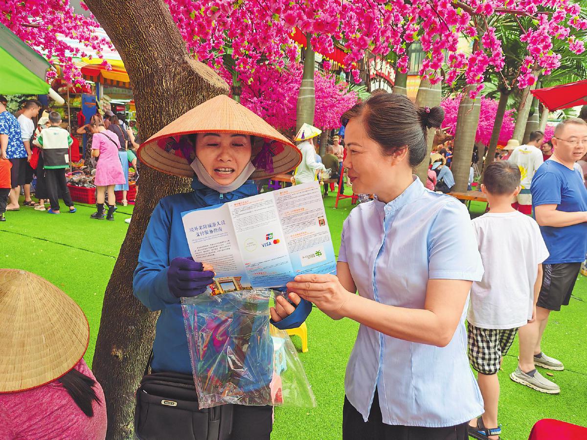 邮储银行福建省南平市分行工作人员在网点周边向外籍客户宣传“零钱包”。□肖维珍摄