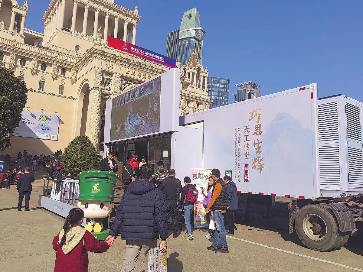中国集邮有限公司、中邮科技股份有限公司联合推出了集古代发明主题邮品展示和LED显示屏、舞台、可拓展体验区等功能于一体的移动展览大篷车,为亚邮展增添了科技味。
