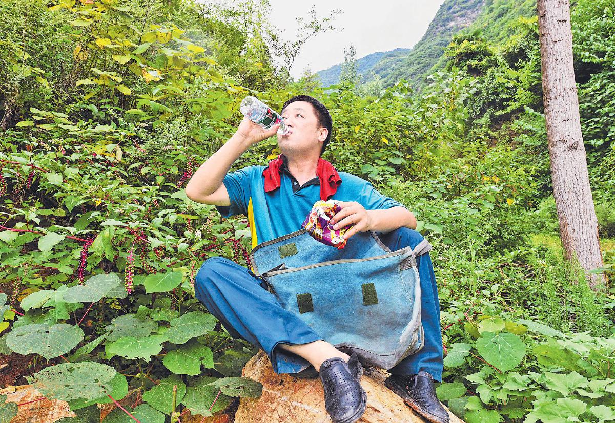 黄德印在投递路上席地而坐,用矿泉水和方便面填饱肚子。