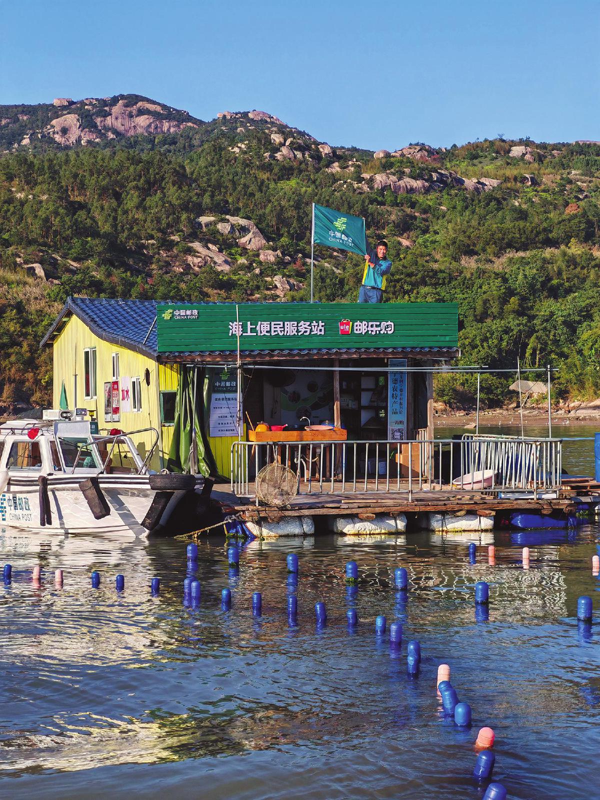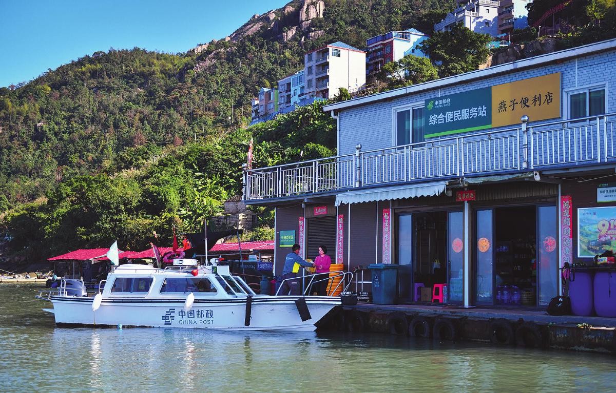 石进全将邮件送达海上邮政综合便民服务站。 □曾祥文 摄