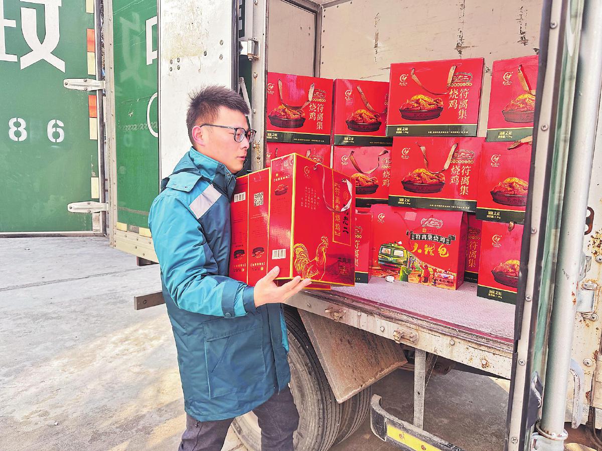 刘闯将刘老二年货烧鸡搬上邮车。□毛圣茹 摄