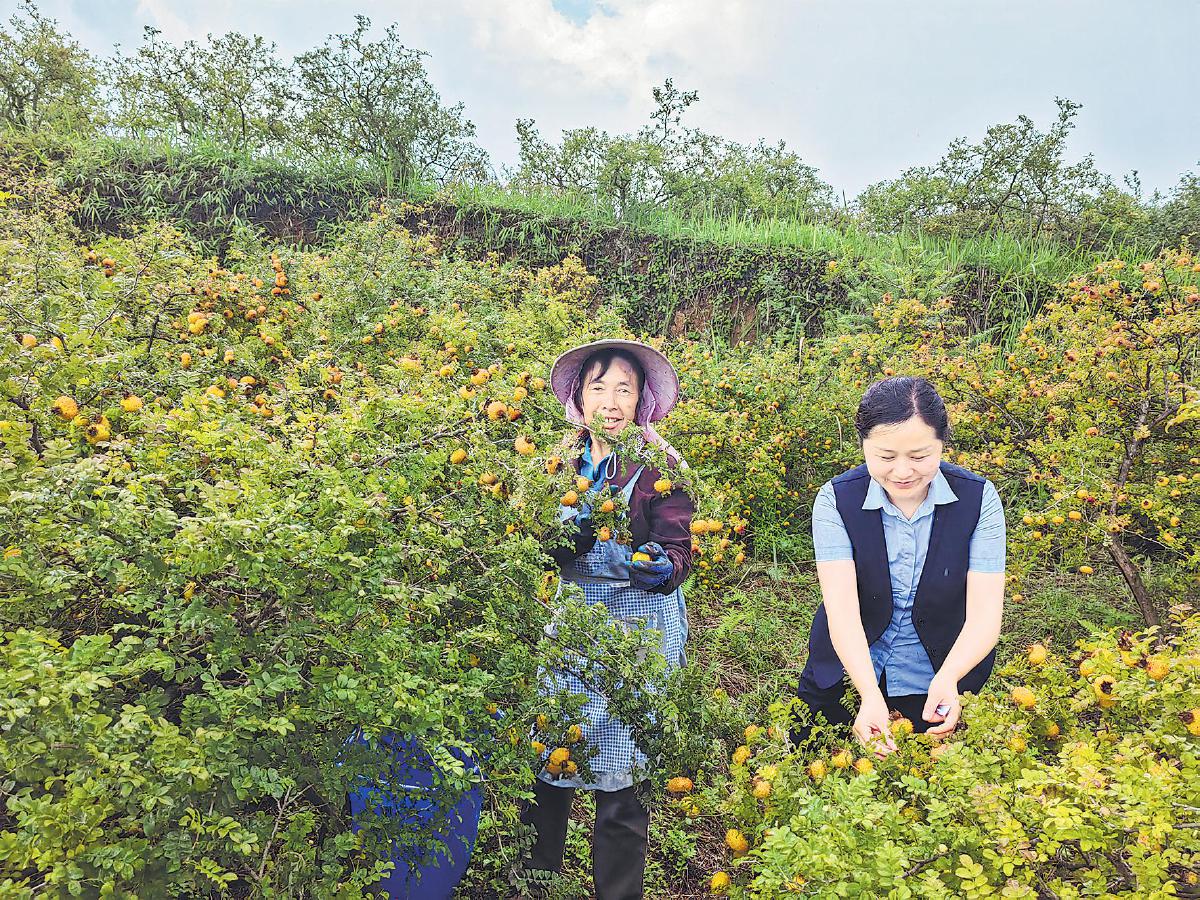 任利华(右)帮农户采摘刺梨。