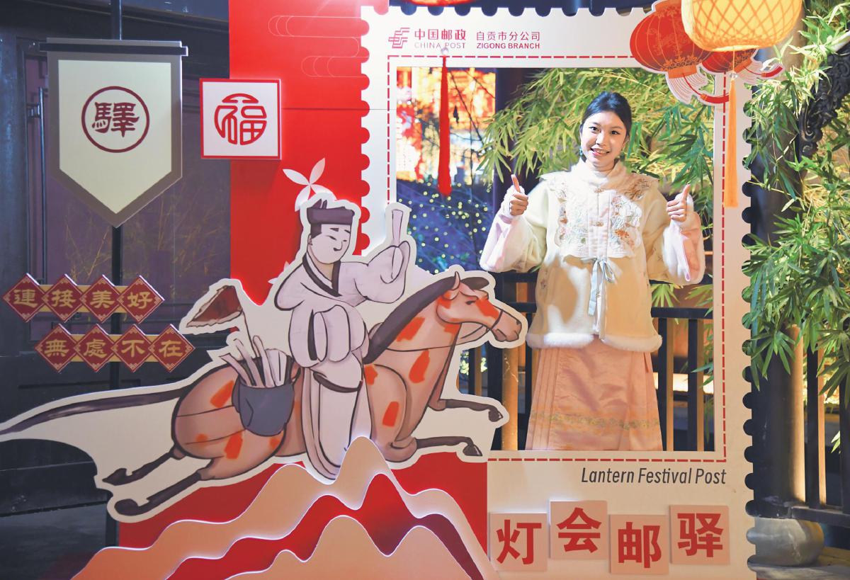 1月17日,四川省自贡市第31届自贡国际恐龙灯会正式开幕。五彩斑斓的灯光交织辉映,勾勒出如梦似幻的奇妙景致。璀璨灯海中,全新亮相的彩灯邮驿别具一格,精心规划了集邮、文创产品、明信片、特色风景戳加盖、自贡特色冷吃系列美食以及邮寄服务六个特色专区,为游客呈上一场集文化、美食与便捷服务于一体的盛宴,成为灯会的热门打卡地。