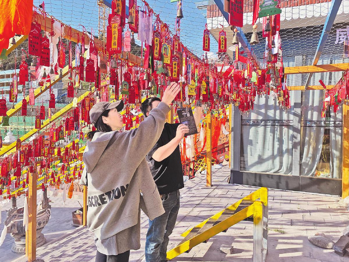 游客在邮局专门设置的祈福区挂上许愿牌。