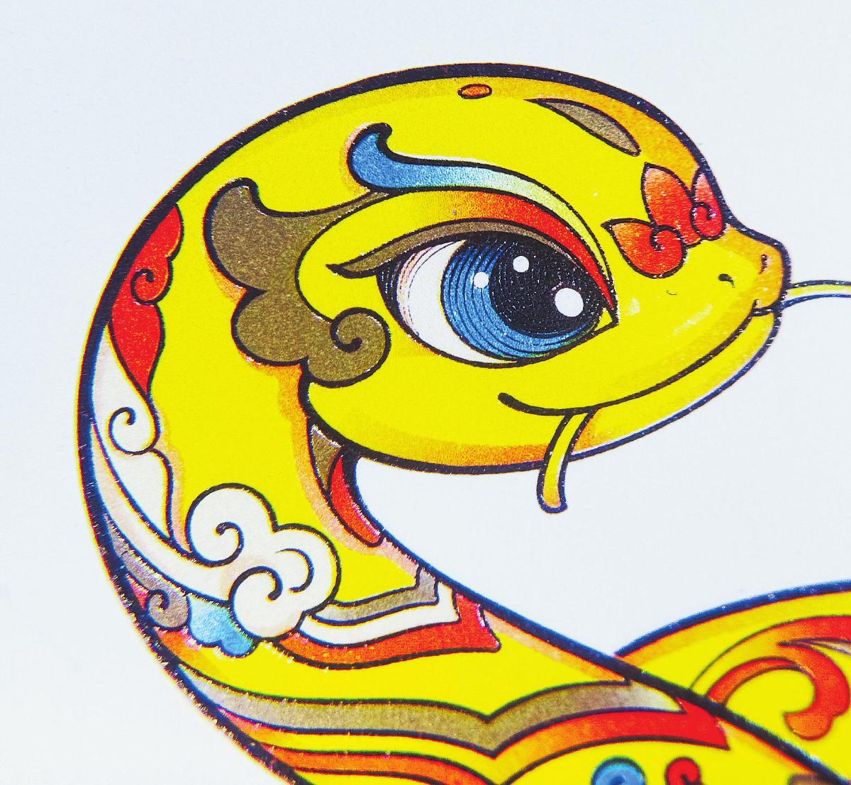 优秀的印制质量离不开优秀的原材料。在此次生肖邮票的印制中,北京邮票厂首次使用了新研发的触感雕刻油墨。雕刻油墨颜色更深更亮,触感更明显。用放大镜观察《乙巳年》特种邮票中的雕刻线条,可以看到绘画笔触似的刀锋,用手指在纸上轻轻抚摸时,图像轮廓有明显的凸起感。