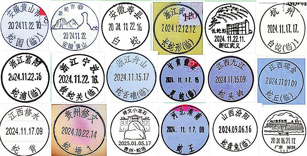 蛇年即将来临之际,各地邮政临时启用的部分含“蛇”字临戳、风景戳。