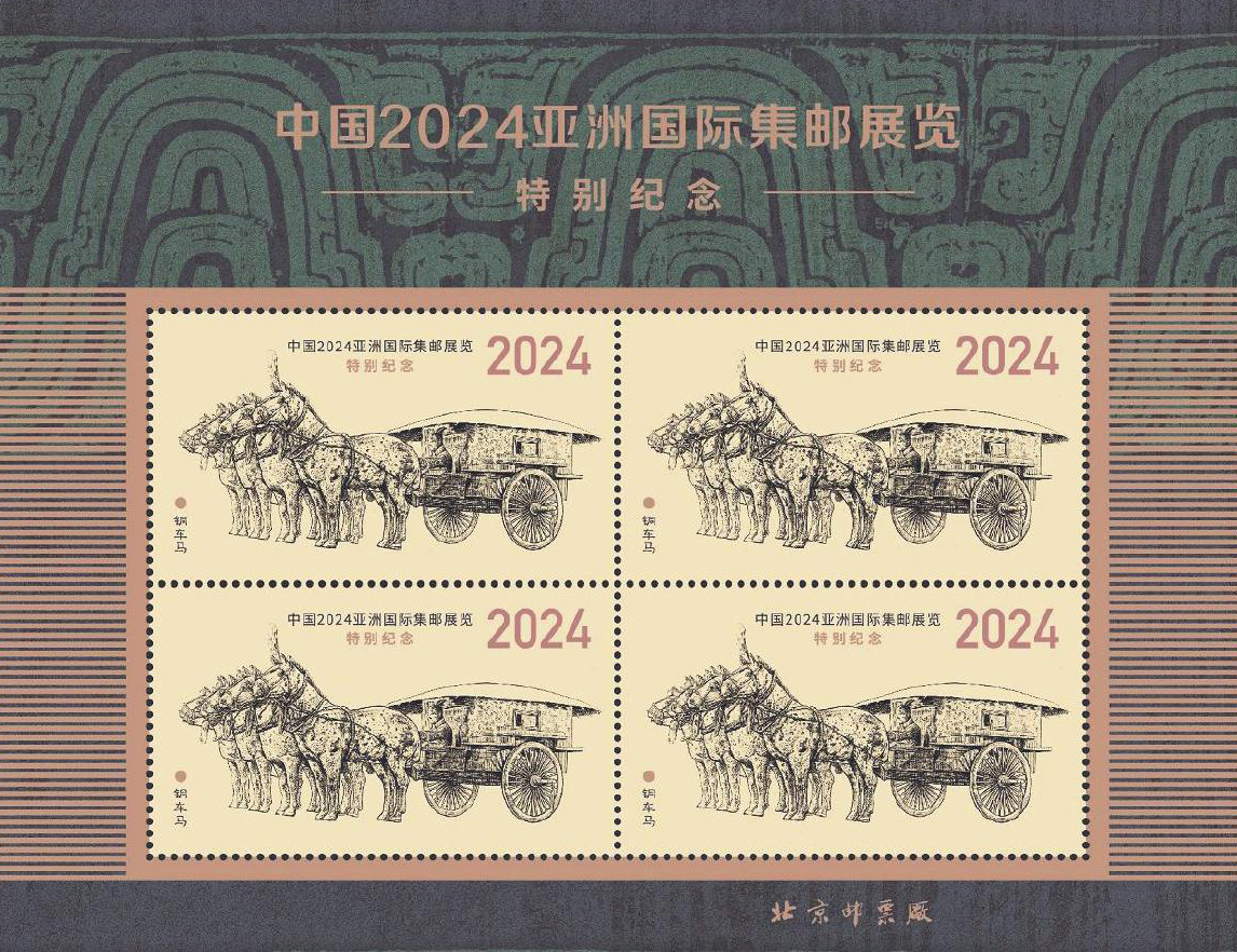 主图选定后,北京邮票厂设计师夏竞秋负责纪念张的整体设计工作。整版纪念张采用四方联的双联张形式,首次以带测控条的完整原始印张呈现。作为《中国2024亚洲国际集邮展览》纪念邮票第1枚“鼎启新章”的设计者,夏竞秋选用上海博物馆镇馆之宝——大克鼎器身花纹作为边饰,色彩厚重古朴,与主体铜车马雕刻图案相互衬托,互为呼应,彰显出浓重的历史文化特色。